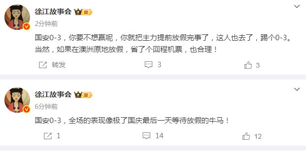 媒体人徐江用一个形象的比喻来点评这场比赛,“国安0-3,全场的表现像极了国庆最后一天等待放假的牛马!你要不想赢呢,你就把主力提前放假完事了,这人也去了,踢个0-3。当然,如果在澳洲原地放假,省了个回程机票,也合理! ​​​”