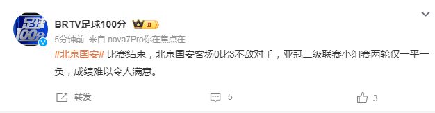 而北京媒体《足球100分》栏目,也直言不讳指出球队表现无法令人满意,“比赛结束,北京国安客场0比3不敌对手,亚冠二级联赛小组赛两轮仅一平一负,成绩难以令人满意。 ​”