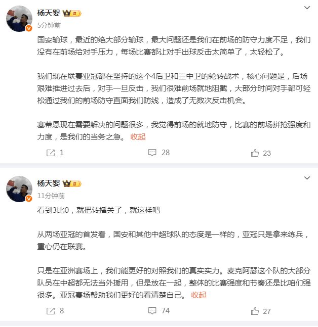 北京媒体人杨天婴则认为,国安给对手的机会太轻松了,“我们现在联赛亚冠都在坚持的这个4后卫和三中卫的轮转战术,核心问题是,后场艰难推进过去后,对手一旦反击,我们很难前场就地阻截,大部分时间对手都可轻松通过我们的前场防守直面我们防线,造成了无数次反击机会。”
