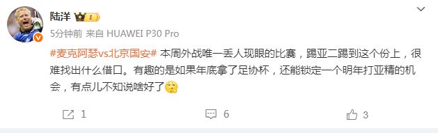 媒体人陆洋则毫不客气表示,这是中超球队本周唯一丢人的外战,“本周外战唯一丢人现眼的比赛,踢亚二踢到这个份上,很难找出什么借口。有趣的是如果年底拿了足协杯,还能锁定一个明年打亚精的机会,有点儿不知说啥好了。”