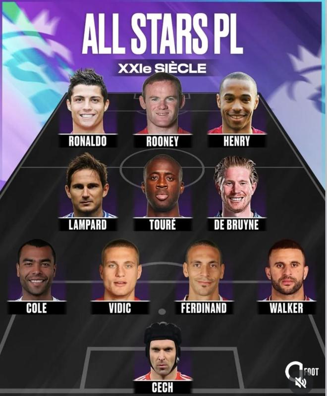 近日某海外足球媒体发布了“英超21世纪全明星阵容”。锋线给到C罗—鲁尼—亨利,中场是兰帕德—图雷—德布劳内,后防科尔—维迪奇—费迪南德—沃克,门将切赫。最大争议:曼城王朝却只上了德布劳内,阿圭罗、席尔瓦、萨拉赫、范戴克、阿利松等名将无缘——按冠军统治力和个人影响力,你认同这套11人吗?