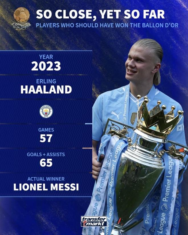 三冠王+英超与欧冠破纪录射手,纯产量碾压;三冠在手,英超与欧冠双线破纪录,数据碾压;但投票时世界杯光环尚未退去,红利更多给了梅西,他输在时间点。